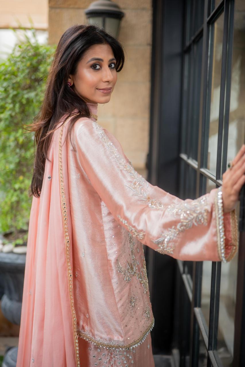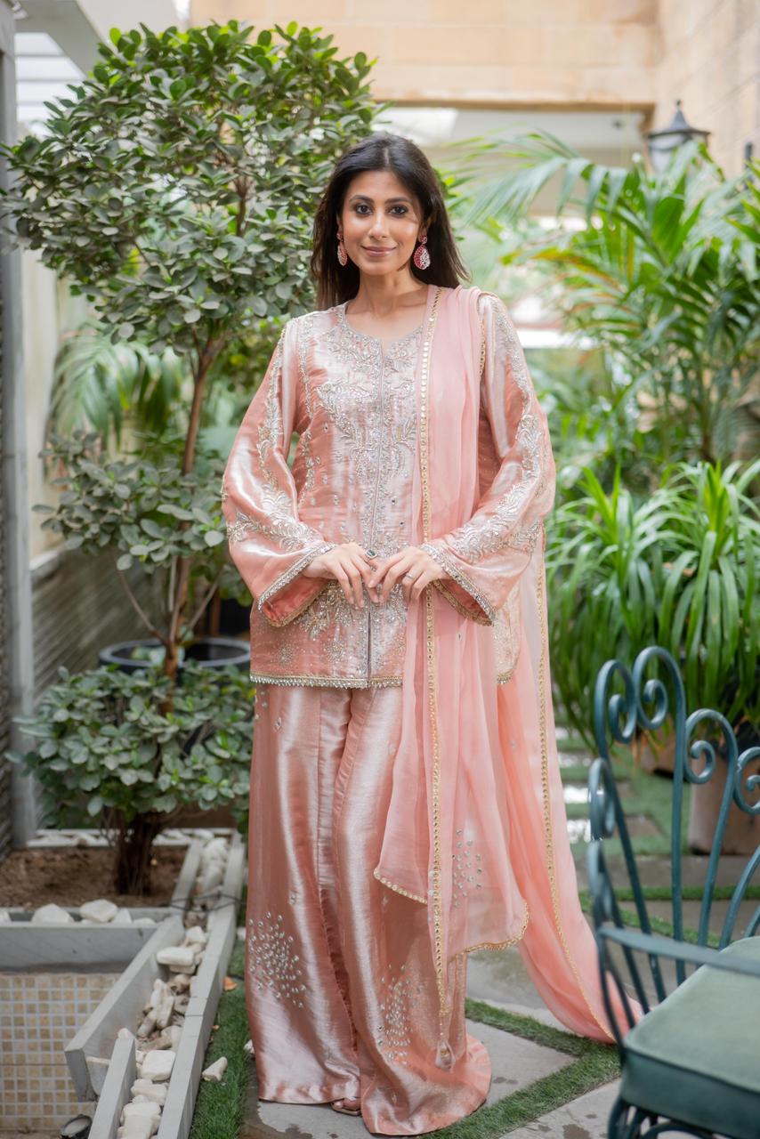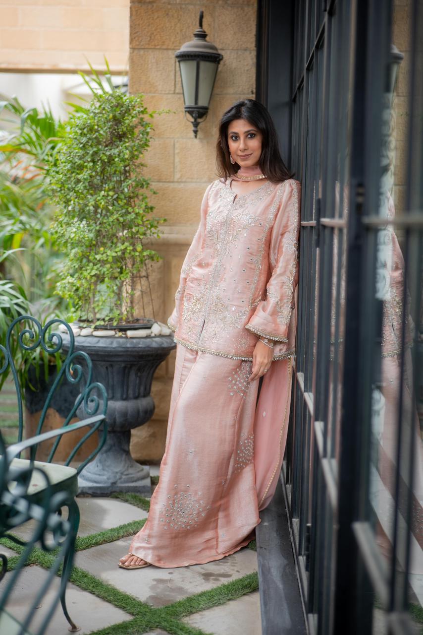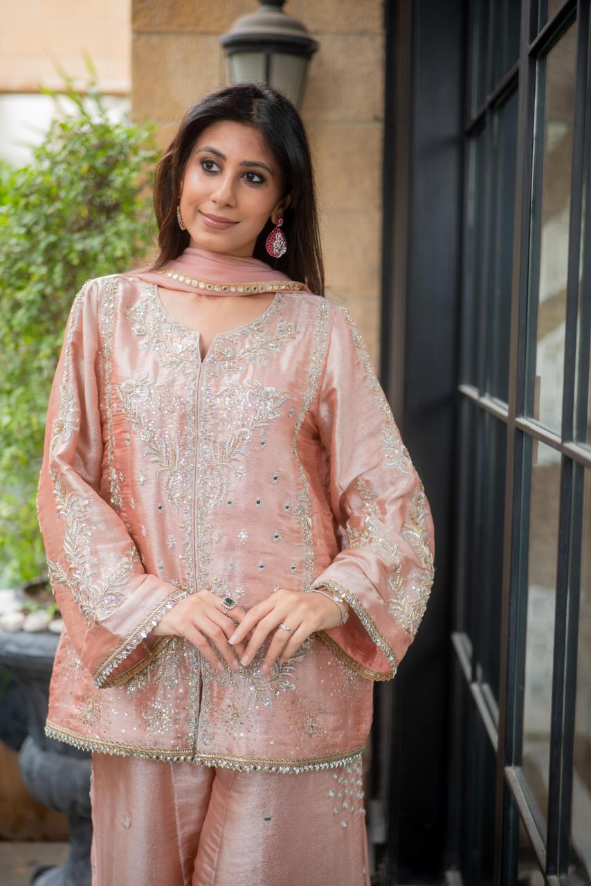 A soft blush ensemble featuring hand crafted and mirror work, paired with fluid trousers and a sheer dupatta. Designed for effortless elegance, this timeless look is perfect for festive and formal occasions.