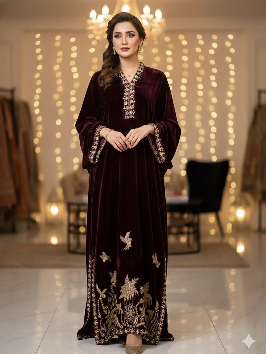 A pure velvet long kaftan-style shirt featuring elegant zari handwork on the neckline and hem. Paired with silk pants, this outfit offers a graceful silhouette, perfect for festive and evening wear.